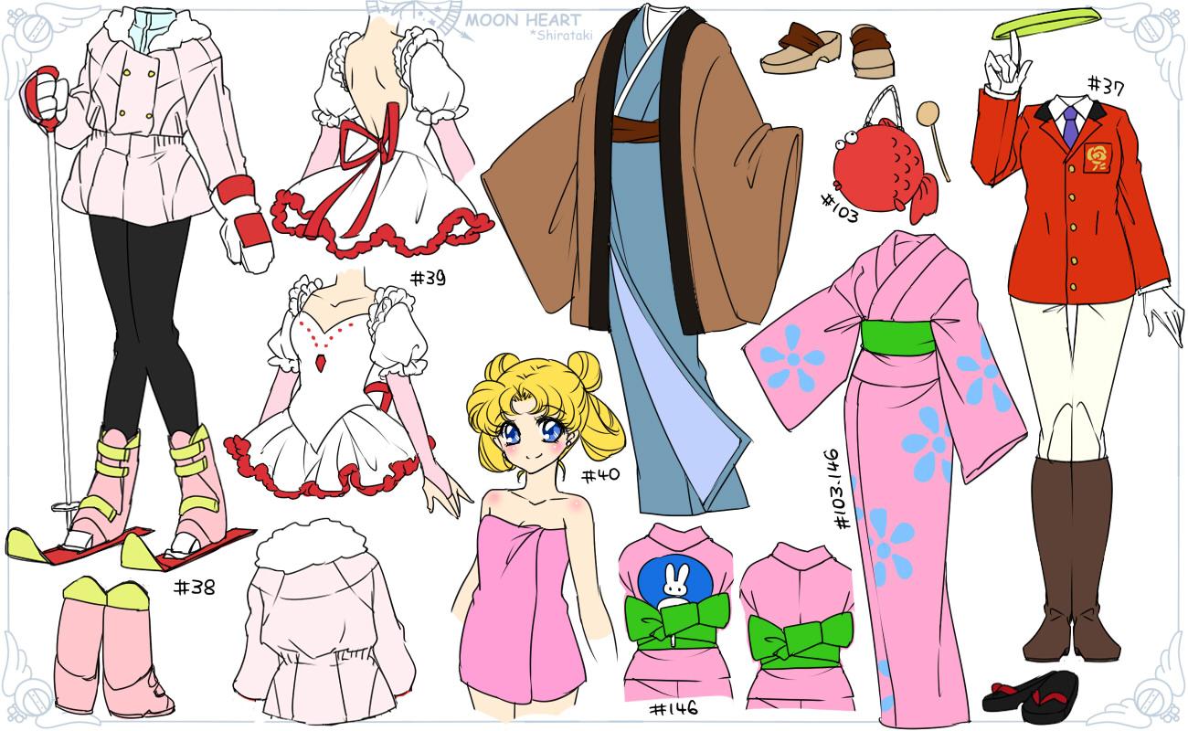 ア イ テ ム | +変身ブローチ(原作Act.1~・アニメ第1話~) 原作・アニメ共にルナによって与えられた(形状はそれぞれ異なる) +ハート・ムーン・ブローチ(ドラマAct.1~) ペンアントが変化したブローチ、ムーンライト・スティックが収納されている。 +ティアラ(原作Act.1~・アニメ第1話~・ドラマAct.2~) 原作では第三形態まで進化する。 +ムーン・スティック(原作・アニメ第25話~・ドラマAct.1~) 原作・アニメ共にルナによって与えられた。 アニメでは虹水晶に反応し、原作第一期終盤では柄が伸び銀水晶の力を引き出した。 ドラマではムーンライト・スティックと呼ばれ、Act.10から浄化の技を放つようになった。 +幻の銀水晶(原作Act.9~・アニメ第35話~・ドラマAct.25~) 前世の記憶を取り戻した時、うさぎの涙から結晶化、その輝きは生命を活性化させる力を持つ。原作では入手当初は抜け殻のため力を使うことができなかった。 アニメでは入手後ムーン・スティックに装着された。 完全な力を取り戻し、力を開放するとと蓮型に変形する(原作・アニメ)。 ドラマでは王家の血を引くうさぎの体内に宿っており、その欠片は彼女の涙として体外で結晶化する。最後の戦いの後、世界を再生し完全に砕け散った。 | |