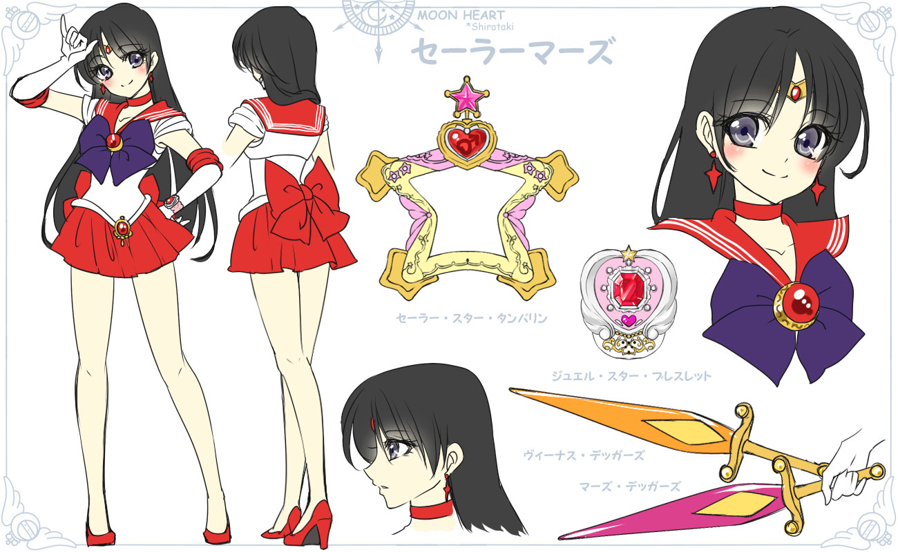 ア イ テ ム | +変身ペン(原作Act3~・アニメ第10話~) 原作ではルナから預けられたマーキュリーによって渡された。 アニメではルナがわざと神社に落とし、拾わせた。 +お札(原作Act3~アニメ第11話~) 「悪霊退散」のお札で邪気を払うことができる。 +ジュエリー・スター・ブレスレット(ドラマAct3~) 変身時に使用したブレスレット。 +セーラー・スター・タンバリン(ドラマAct26~) +マーズ・デッガース(ドラマAct49) マーズのタンバリンが火星と炎の力で変化した両刃短剣。 | |
