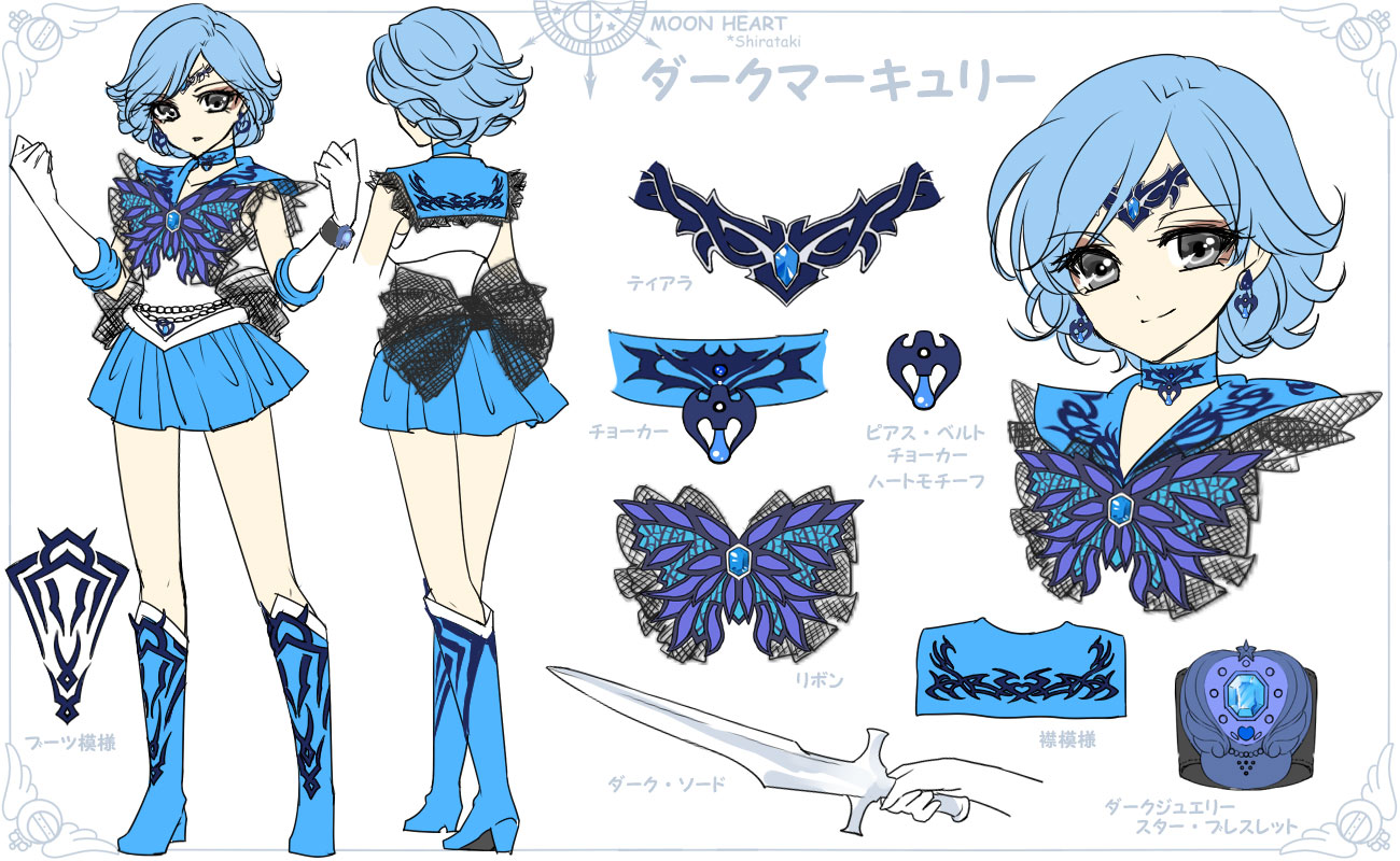 ア イ テ ム | ★マーキュリー・クリスタル(原作Act40~) 守護力精霊(セーラーパワーガーディアン)の力をかりて誕生したハート型の青いクリスタル。 ★クリスタル・チェンジ・ロッド(アニメ第143話~) ペガサスの力でスター・パワー・スティックからチェンジした。 ★マーキュリー・ハープ(原作Act40~) 水流をイメージした竪琴で、意思を持っている。 ★ゴーグル() ★ポケットコンピュータ() | |