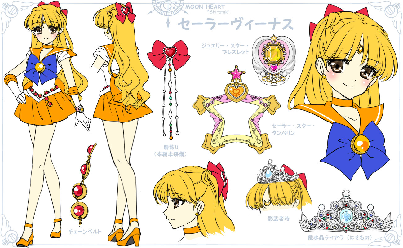 ア イ テ ム | +変身ペン(原作Act8~・アニメ第36話~・V1~) 初登場時から所持、 形状は原作とアニメで異なる。VではセーラーVに変身していた。 +チェーンベルト(原作Act8~) 腰につけ武器としても使用している。 +伝説の聖剣(原作Act10~) 月に封印させていた石の剣。 4戦士のものとされるが、抜いたのも主に使用しているのも彼女。 石化中でもダイヤモンドをも傷つけることができる。 +ジュエリー・スター・ブレスレット(ドラマAct~) 変身時に使用したブレスレット。 +セーラー・スター・タンバリン(ドラマAct28~) |